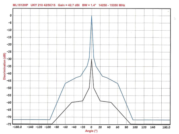 FREQUENCY 14400MHz – 15350MHz VSWR 1 : 1.3 Gain 41.8 dBi F/B -74F/S -29